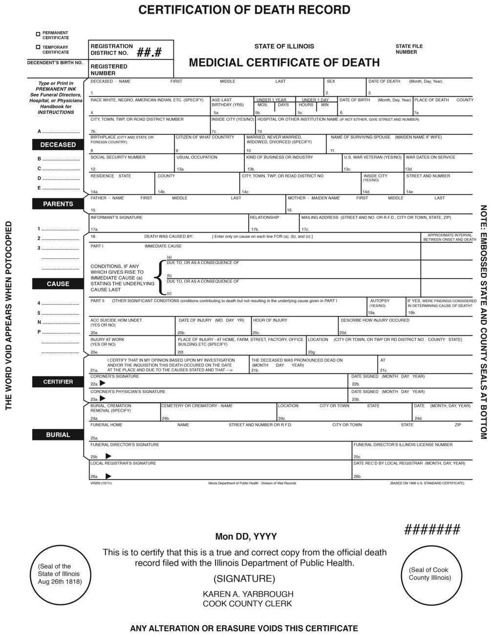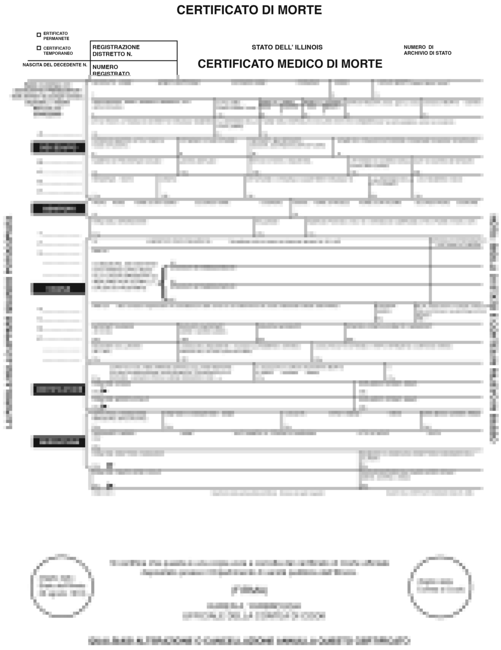 This is a PDF template for an Italian translation of a State of Illinois death certificate (circa late 1970s).