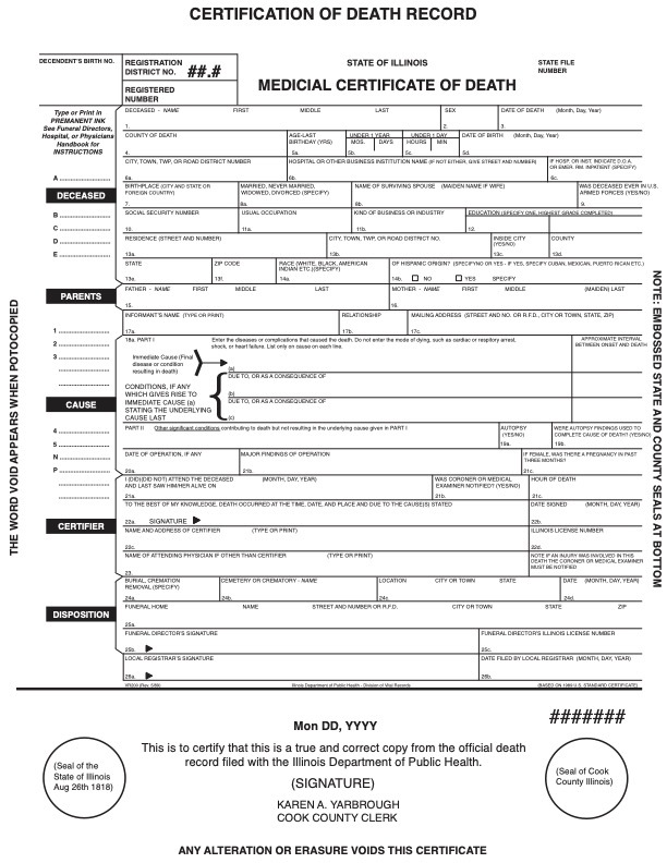 This is a PDF template for an Italian translation of a State of Illinois death certificate (VR200 Rev. 5/89) circa 2000s.